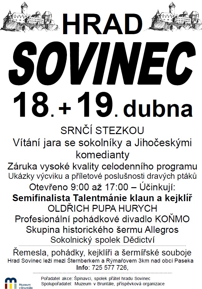 Víkendové vítání jara se sokolníky, ukázky výcviku a příletů dravých ptáků, fotografování s dravými ptáky. Bude připraven bohatý doprovodný program na pátém nádvoří. Uvidíte známé komedianty a kejklíře, různorodá šermířských vystoupení a souboje, loutkové divadlo, ukázky historických řemesel a mnoho dalšího. Pořádá historická posádka Špinavci.
